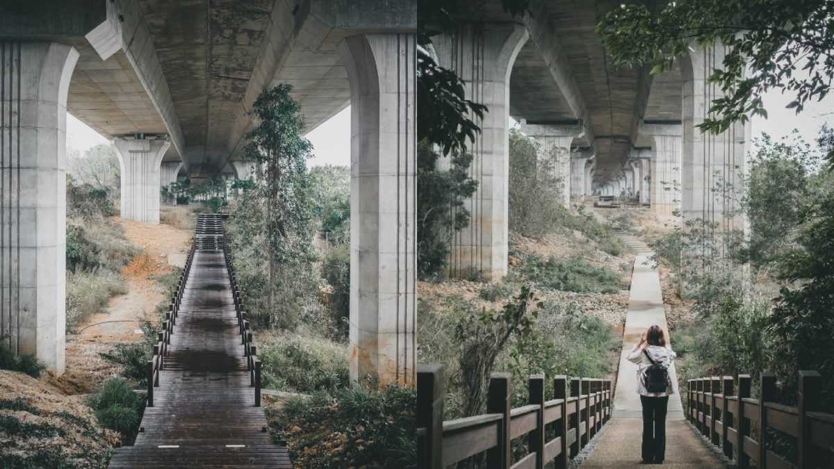 ▲「沙鹿休閒景觀步道」為全台唯一沿著國道高架橋下興建的步道,地點就位於國道三號高架橋下。(圖片來源:是艾思,不是火拳。)